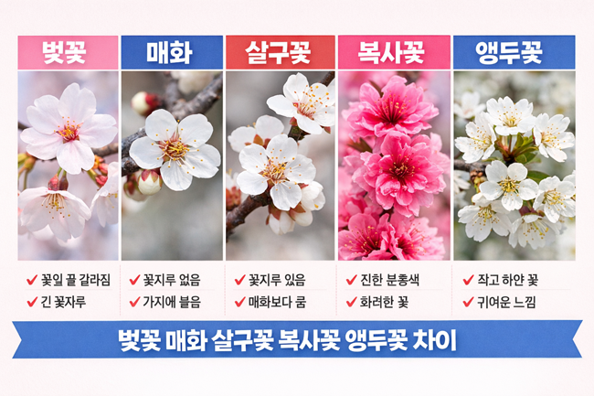 벚꽃 매화 살구꽃 복사꽃 앵두꽃 차이 핵심 요약